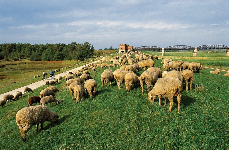 Rebaño de ovejas en el malecón cerca del Puente Viejo sobre el Elba en Damnatz